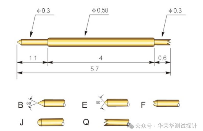 探针的总长度也是决定其应用范围的一个因素,例如:一款产品型号为DP038-BU-5.7L的双头针的总长度为5.7mm。
