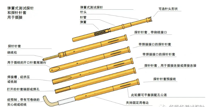 测试治具的工作行程和测试点需要不同的安装高度,为了可以调整安装的高度,探针针套制造了卡环和压环系列,方便测试架上适用各种高度的测试,另外针套的连接测试板的一端的接口设计了不同的连接方式,有绕线、焊线等,能更好的为使用者服务。