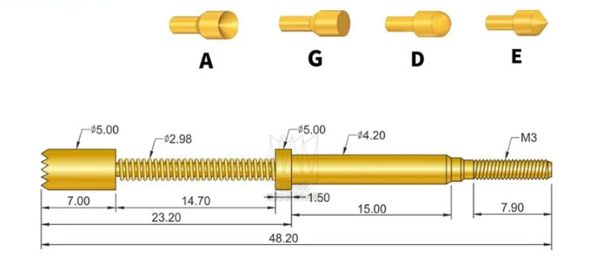 420*4820大电流探针的头型有凹头、平头、圆锥头、梅花头等,常规的针头直径是5.0mm以及加大头部8.0mm,针身的直径:4.20mm,针长:48.20mm,常规电流:15A、20A、25A,最大电流可过:100A,常用的弹力:650g和1000g。