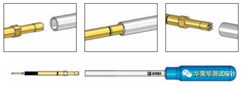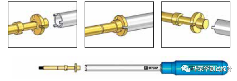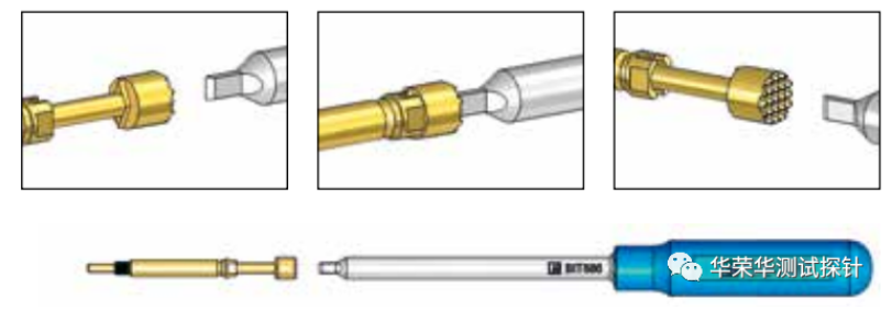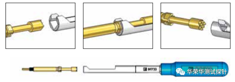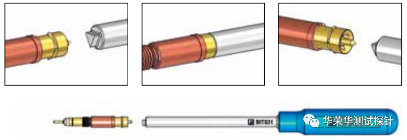 为了方便安装和更换探针和针套,华荣华提供各种各样的工具。安装标准探针需要 实用的插入或旋入工具,对于安装可调节开关触点的开关式探针,则需要一把简单高效的工具,另外,弹力测试仪可用于点检模块内探针弹力情况。