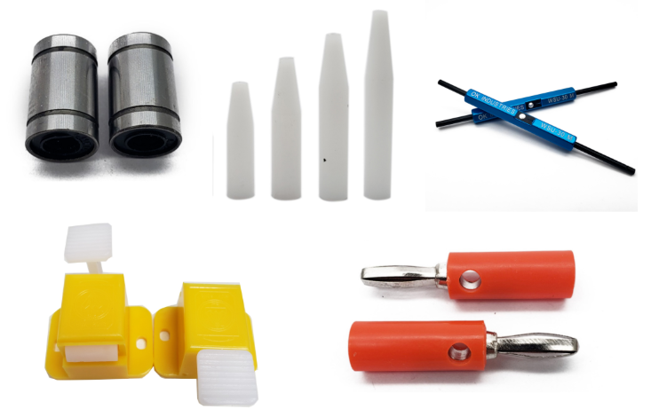 华荣华的探针配件有:机架扣、轴承、压棒、OK线、绕线笔、定位柱、导柱等。